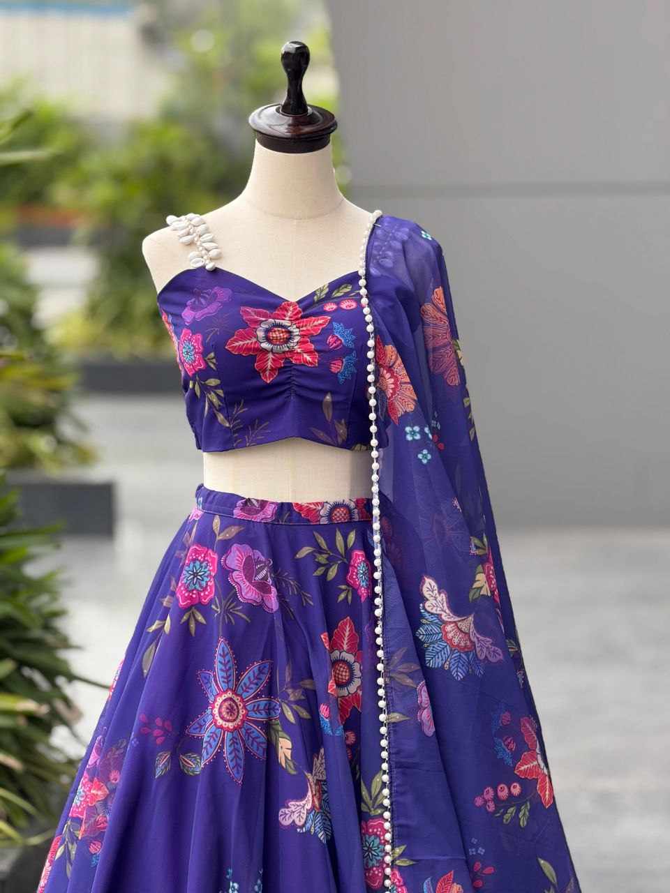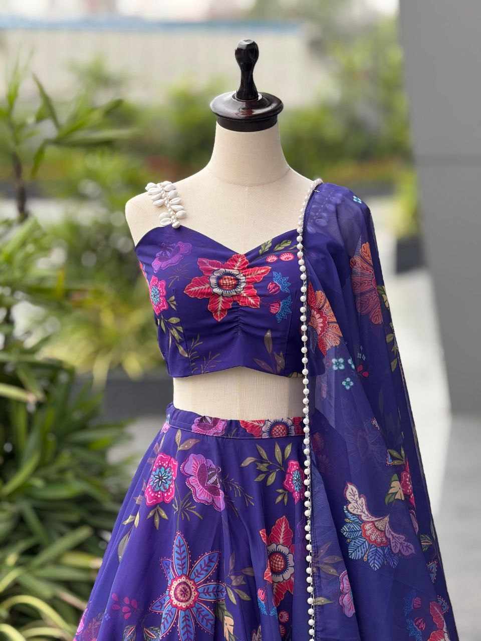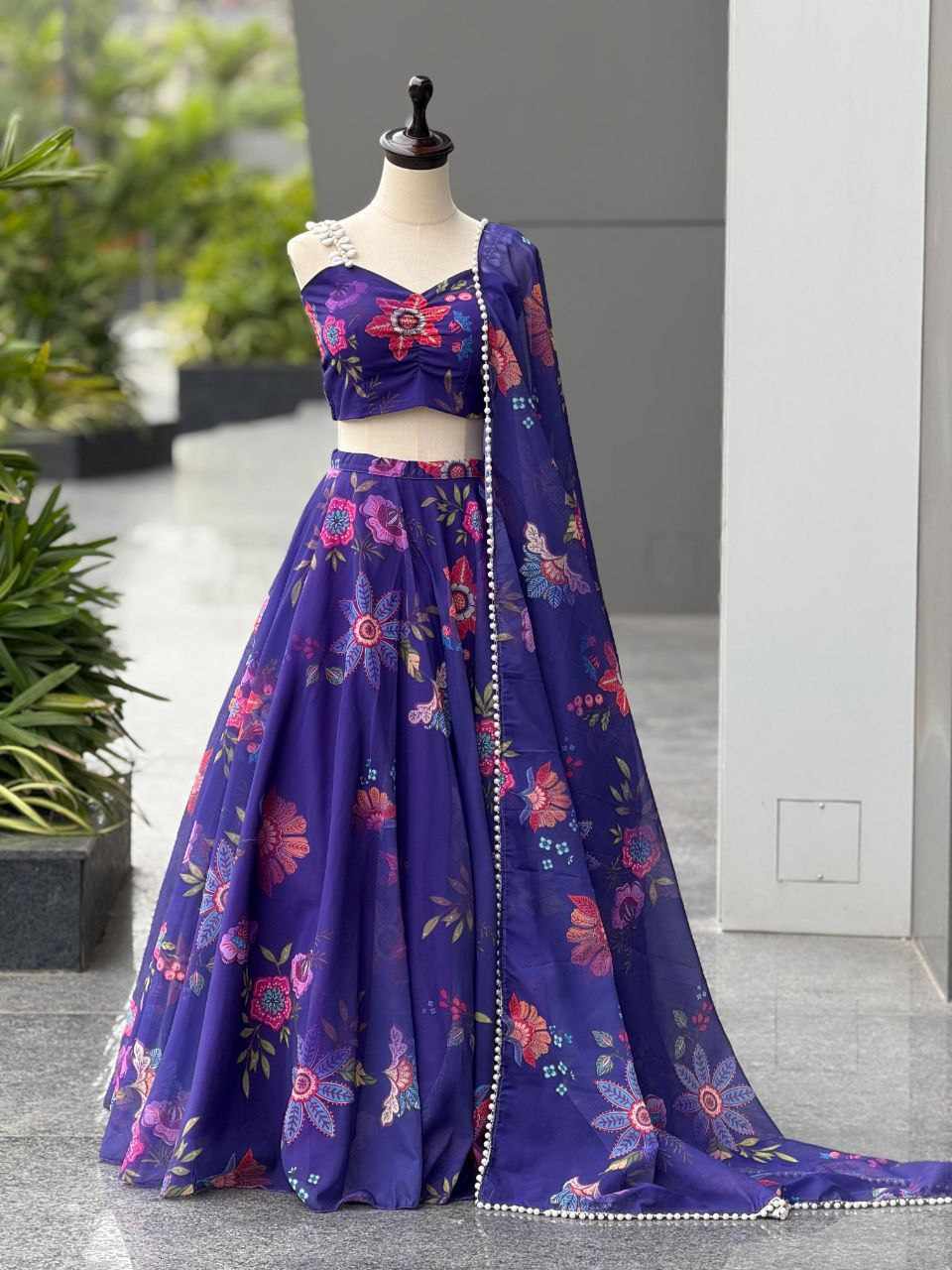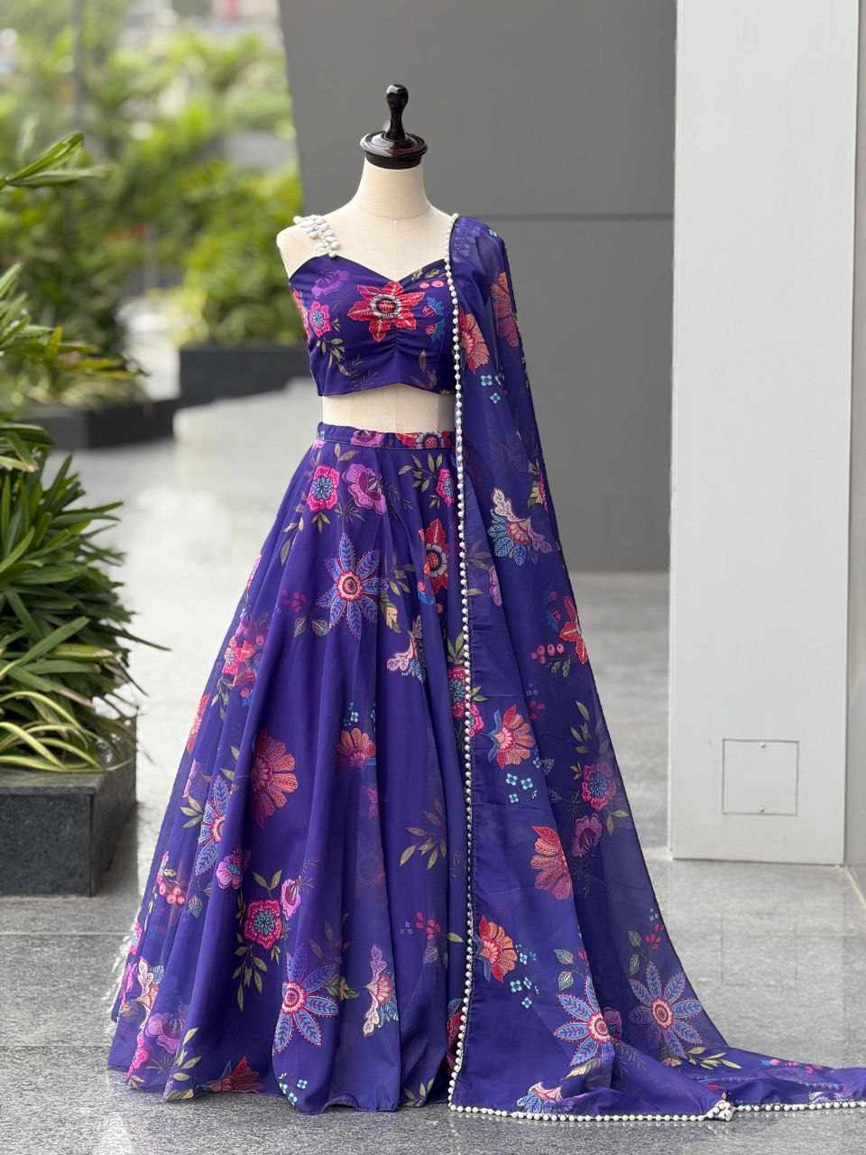 Lehenga – Pure organza silk digital printed lehenga with a grand 8-meter flair, finished with canvas patta